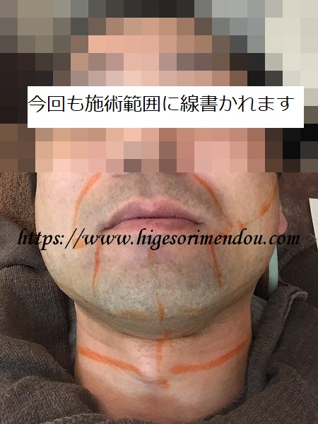 って聞かれて効いてきてますと言うと照射開始です。試しに髭の密集が少ない頬の部分へテスト照射